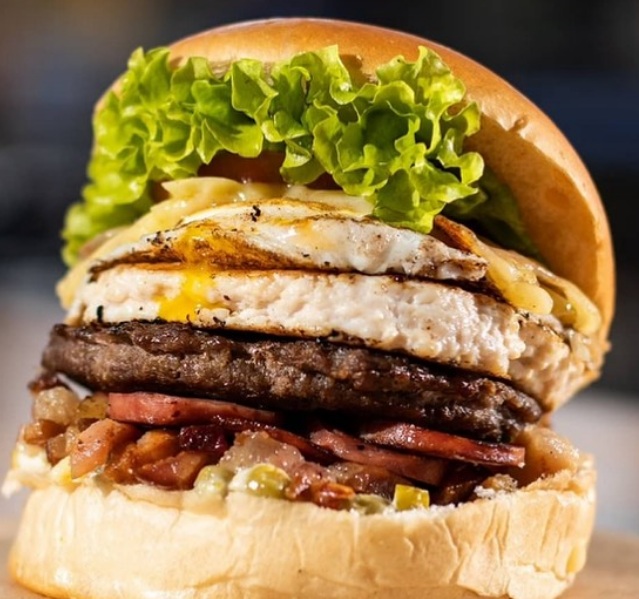 Pão, Carne de hambúrguer, frango, ovo, queijo, presunto, salada, milho, batata palha e maionese.